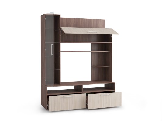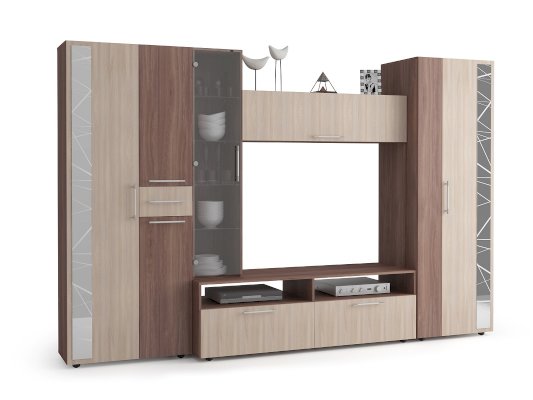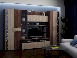 Компактная и функциональная стенка Дарина позволяет разместить множество предметов и защитить их от пыли, а также создать приятное настроение в комнате. Эта модель не только украсит гостиную, но и позволит аккуратно разложить и расставить десятки вещей. Такая стенка оригинально оживит интерьер, послужит отличным местом для хранения вещей, витриной для книг и комнатных украшений, и конечно, своё достойное место на ней найдёт телевизор – он станет главным визуальным акцентом композиции. Симметричный дизайн и сочетание контрастных оттенков цвета понравятся приверженцам классических линий, изготовленная из ЛДСП, она легко впишется практически в любую обстановку. Конструкция стенки сочетает в себе открытые ниши, вместительный выдвижной ящик, а также полочки за стеклянными и глухими дверцами.