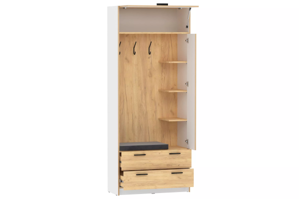 Шкаф оснащен полкой для хранения вещей, которая открывается с помощью газлифтов, которые которые фиксируют положение фасада в открытом виде, а также двумя выдвижными ящиками с шариковыми направляющими, за счет которых они выдвигаются плавно и бесшумно. В комплект модуля входит также мягкий элемент в цвет фасада и позволяет использовать часть шкафа в качестве посадочного места при сборах. За распашной дверкой удобно разместить ключи, документы и прочие принадлежности. Шкаф является модульным, что позволяет комбинировать его с другими шкафами и тумбами из одноименной коллекции. Лаконичный дизайн шкафа гармонично подчеркивается черными ручками. Сборка шкафа универсальна – распашная дверь может крепиться как на правую, так и на левую стороны.