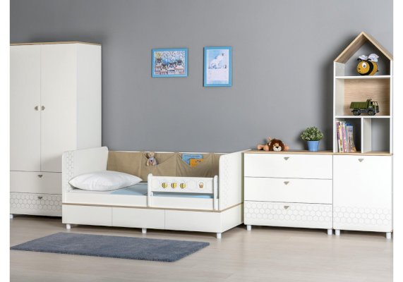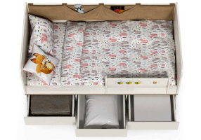 Односпальная кровать оснащена съёмным мягким элементом с карманами — можно легко снять для стирки. Съёмный бортик на кроватке. Оригинальная фотопечать. В основании кроватки размещены - три выкатных ящика.