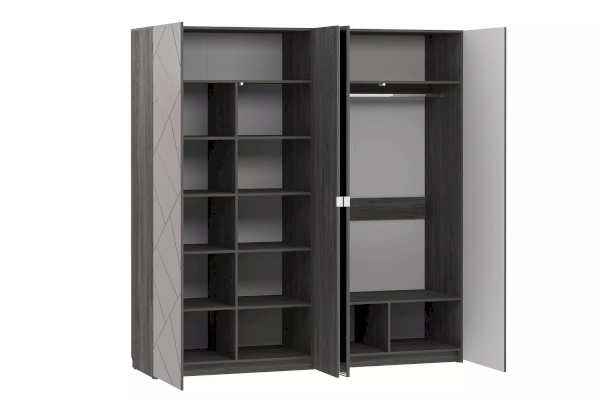Четырехстворчатый шкаф Summit НМ 011.48 станет достойной альтернативой гардеробной комнате, сэкономит пространство и задаст стиль интерьеру спальни. Внутри модуль разделен на две равные секции. В левой части шкафа находится секция из восьми полок для хранения одежды в сложенном виде. В правой половине модуля установлена штанга для одежды на вешалках плечиках. Зеркальные фасады добавят свет и визуально расширят комнату.