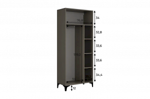 Шкаф оснащён надёжными металлическими ручками и имеет удобное внутреннее наполнение: справа расположены полки, а слева — штанга для вешалок. Это позволяет рационально использовать пространство и разместить различные типы одежды.
