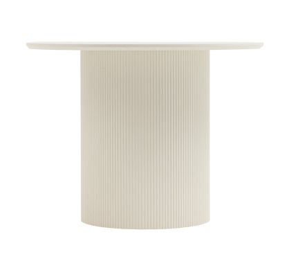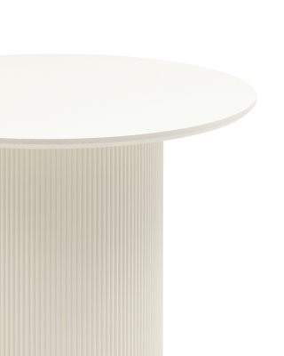 Столешница выполнена из прочного и долговечного МДФ. Светлая поверхность столешницы гармонично сочетается с массивной основой. Простая круглая форма стола позволит легко вписать его в современный интерьер, стол украсит кухню, гостиную или современное кафе, ресторан. Опорное плиссированное основание стола в лаконичном дизайне надёжно удерживает всю конструкцию и дополняют монолитный образ.
