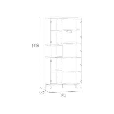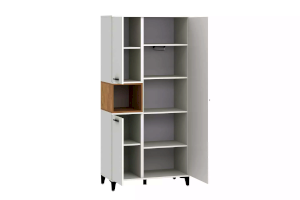Шкаф оснащен полками за распашными дверками и открытой нишей, которая может быть собрана как на правую, так и на левую стороны, и в ней можно удобно расположить книги или элементы декора, а высокие опоры придают внешнюю легкость и обеспечивают быстрый и легкий доступ во время уборки.