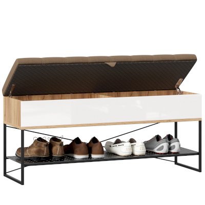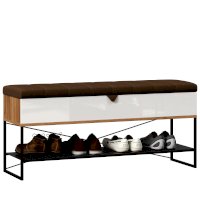 • Скамья установлена на опорный металлический каркас со стационарной металлической полкой для обуви. (полка с перфорацией)